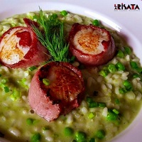 Pan seared fresh scallop wrapped with beef bacon, on a bed of green peas, asparagus & spring onion risotto