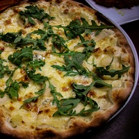 Pizza with truffle cream, air dried beef, rocket leaves, marinated fresh tomato & parmesan cheese.