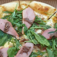 Smoked duck, rocket, anchovy, caramelized onion & mozzarella