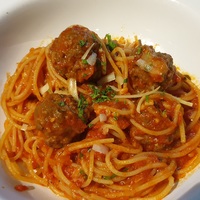 Spaghetti with gourmet beef meatballs in tomato sauce