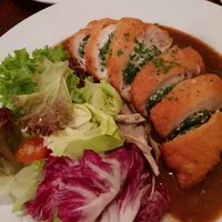 Deep-fried bread crumbed chicken breast stuffed with ricotta & spinach