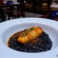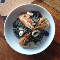 Angel hair pasta with prawn, squid & roasted cherry tomatoes in squid ink sauce