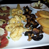 A selection of our popular antipasti - grilled mushroom, deep fried calamari rings, beef carpaccio & garlic crostini with port wine & brandy infused chicken liver pâté