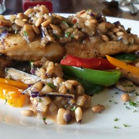 Pan-fried fillet of barramundi topped with sautéed eggplant, anchovy, garlic, chili flakes & pine nuts served with julienned vegetables