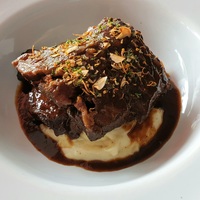 Wood fired oven roasted beef ribs in a reduction of red wine sauce on a bed of mashed potato