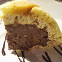 Liqueur dome cake filled with chocolate & vanilla cream with almond, hazelnut & chocolate bits